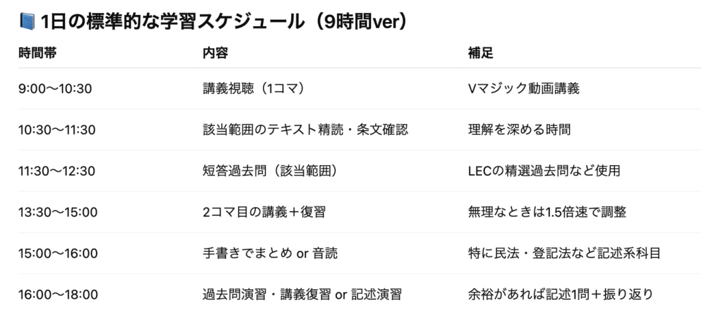 スケジュール表の作成 | 月・週単位の到達目標を決める(例:8月中に民法の講義8コマ) |